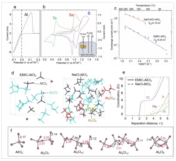 团队首先探究了在熔融盐电解质中铝负极的可逆沉积/剥离行为以及硫族正极(S、Se和Te)的本征氧化还原电化学反应,证明了熔融盐电解质在正极侧和负极侧均具有低极化、高反应可逆性。通过测试Al|Al对称电池在不同工作温度下Al沉积/溶解的交换电流密度,定量评价三元熔融盐和离子液体两种电解质的电荷转移动力学。结果分析表明在相同工作温度下,熔融盐电解质中实现的交换电流密度比离子液体高一个数量级,且活化能仅为0.19 eV,低于离子液体(0.26 eV),证明其具有更快的电荷转移动力学。进而采用拉曼光谱和核磁共振谱,结合分子动力学模拟,系统分析无机熔融盐电解质和离子液体中的团簇构型、铝离子配位结构及其脱溶剂化动力学,进一步揭示了无机熔融盐电解质具有丰富的高阶AlnCl3n+1–组分,更利于脱溶剂化,这是熔融盐电解液快速反应动力学和抗枝晶生长特性的根本原因。
