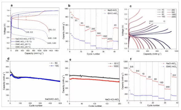 针对这一关键问题,北京大学材料学院庞全全团队及其合作者首次报道了一种高安全不可燃、超低材料成本、可实现快充的熔融盐铝电池。通过使用一种低熔点的无机氯化物熔融电解质,成功替代了当前的离子液体,实现铝电池的高倍率运行、低电压极化及高能量效率;同时熔融盐电解质的热稳定性高,不可燃,使得电池体系具有高安全性,解决了大规模集成系统安全性方面的疑虑。另外,该电池体系使用元素丰富的硫作为正极,在较低的温度110摄氏度下运行,表现出了高比容量及超快充特性。