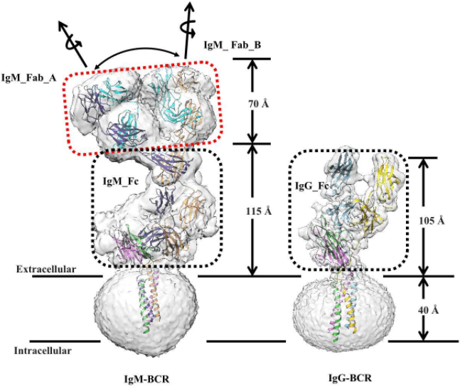分泌型sIgM和膜结合型mIgM-BCR复合物结构比较