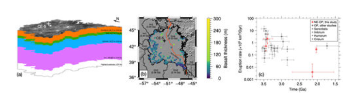 研究结果表明,嫦娥五号着陆区至少经历了四次火山岩浆喷发,厚度中值分别为230米、70米、4米以及36米(图3a)。而从玄武岩厚度的空间分布趋势来看,可以发现随着距离Rima与Mairan两条月溪越远,玄武岩的厚度逐渐递减,这表明Rima与Mairan两条月溪的火山口为嫦娥五号着陆区玄武岩的喷发源头(图3b)。进一步地,结合各玄武岩单元的面积与年龄估算结果,计算了嫦娥五号着陆区玄武岩的喷发速率,发现该地区的岩浆喷发通量在月球火山活动晚期(约20亿年前)有显著(约2个数量级)增强(图3c)。