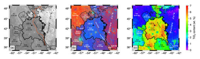 图1. 嫦娥五号着陆区的(a)光学影像、(b)假彩色波段合成影像以及(c)钛含量分布图。