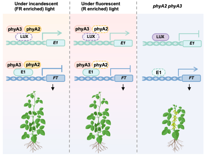 “花褪残红青杏小,燕子飞时,绿水人家绕。枝上柳绵吹又少,天涯何处无芳草”是北宋文学家苏轼创作的一首词《蝶恋花·春景》,描写春天的清新婉丽和对春光流逝的叹息。万物感受季节变化,植物更是如此,植物感受光周期和温度的变化来响应季节的更替和调控自身的生长发育。植物光周期开花由光受体介导,其中光敏色素A起到了核心作用,但是其调控开花的机制尚不清楚。10月4日,PNAS杂志在线发表了我校孔凡江/刘宝辉团队的论文:Novel and multifaceted regulations of photoperiodic flowering by phytochrome A in soybean”,系统解析了phyA介导光周期信号调控夜间复合体(Evening complex,EC)的蛋白稳定性,从而控制开花时间的分子机制。值得一提的是,这是继他们发现EC的重要成员J(ELF3同源蛋白)(Lu et al., Nature Genetics, 2017),和LUX在调控在大豆光周期开花和光周期敏感性的重要作用 (Bu et al., PNAS, 2021)之后,再次鉴定了调控EC复合体的蛋白活性的成员phyA, 从而进一步确立了EC复合体是大豆光周期开花和光周期现象的核心地位。