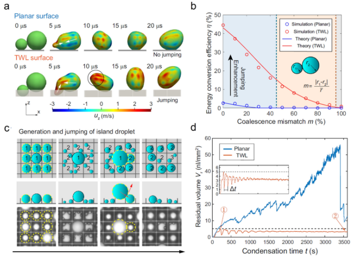 本文进一步研究了“液滴筛”的机理,即液滴弹跳强化和液滴成长隔离的耦合。更具体说,该研究通过严格控制冷凝环境,并用显微镜观测平面和TWL表面,发现了两者的冷凝液滴分布呈显著不同(图1a、1b),后者的冷凝液滴集中分布在小尺度且具有明显的液滴尺寸截断效果(图1b)。观察冷凝液滴的演化过程,不同于平面上的情况,TWL表面跨栅格时的合并具有100%的弹跳概率(图1c)。这种高概率弹跳得益于薄壁栅格对合并过程中液体流动的诱导(图2a),即使在合并液滴的大小失配度较高(>45%)情形下,仍然有足够的液滴表面能-弹离动能转化效率(图2b)。此外,得益于薄壁栅格对生长液滴的隔离,薄壁栅格内的液滴在两轮次的生长周期内,总能与邻居液滴发生合并(图2c)弹离,避免出现更高失配度的液滴合并。相比于平面,TWL表面的残余液体体积在冷凝过程中很快趋于稳定,并被严格限制在极小水平(图2d)。
