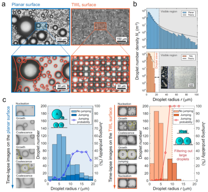 图1.冷凝液滴在超疏水平面及超疏水薄壁栅格表面的分布及演化:(a)平面及薄壁栅格表面的液滴冷凝分布;(b)冷凝液滴在平面及薄壁栅格表面的尺寸分布;(c)平面(左图)及薄壁栅格表面(右图)冷凝液滴的演化过程及合并弹跳概率