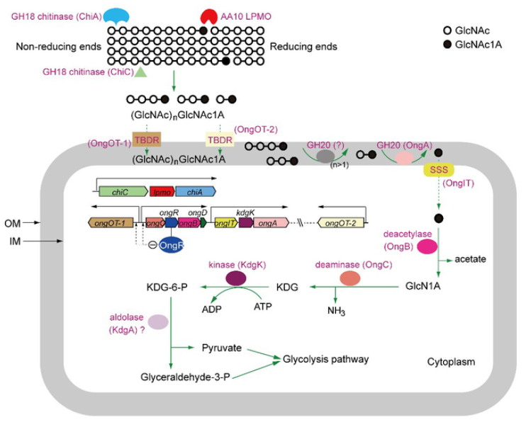 几丁质是自然界中除纤维素以外的第二大生物质资源,其在环境中以结晶形式存在。近年来,单加氧酶(lytic polysaccharide monooxygenase,LPMO)驱动的氧化降解被发现在天然结晶几丁质的降解过程中发挥重要作用。目前已报道的具有几丁质降解活性的LPMO均只能氧化几丁质的C1位原子生成末端为N-乙酰-D-葡萄糖酸内酯(2-(acetylamino)-2-deoxy-D-gluconic acid,GlcNAc1A)的氧化性几丁寡糖。但是,关于细菌(包括陆源和海洋细菌)如何利用几丁质的氧化降解产物至今仍未有研究。