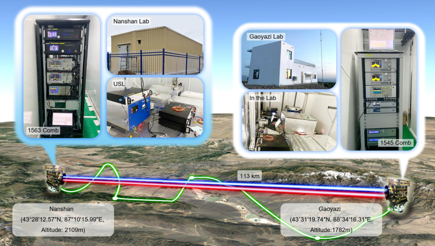 在本工作中,研究团队发展了全保偏光纤飞秒激光技术,实现了瓦级功率输出的高稳定光频梳;基于低噪声平衡探测和集成干涉光纤光路模块,结合高精度相位提取后处理算法,实现了纳瓦量级的高灵敏度线性光学采样探测,单次时间测量精度优于100飞秒;进一步提升了光传输望远镜的稳定性和接收效率。在上述技术突破的基础上,研究团队在新疆乌鲁木齐成功实现了113公里自由空间时频传递,时间传递万秒稳定度达到飞秒量级,频率传递万秒稳定度优于4E-19,系统相对偏差为6.3E-20±3.4E-19,系统可容忍最大链路损耗高达89dB,远高于中高轨星地链路损耗的典型预期值(约78dB),充分验证了星地链路高精度光频标比对的可行性。