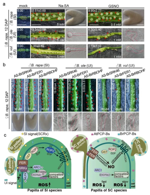 该团队前期发现,大白菜种内自花花粉激活柱头产生活性氧来抑制自花花粉。团队进而以远缘杂交生殖隔离与自交不亲和都表现为柱头对花粉的抑制、以及远缘杂交单向不亲和,这两个现象为出发点开展了本项研究。