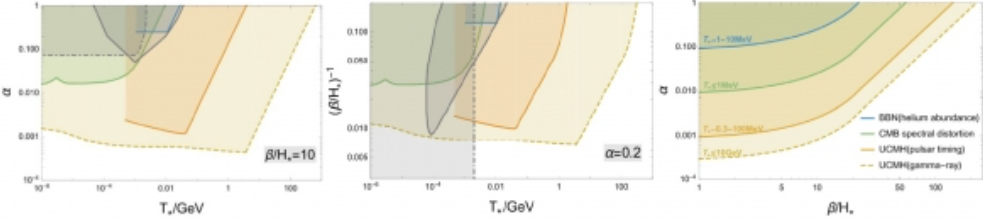 图1:对曲率扰动的不同观测实验对相变参数空间的限制,其中α代表相变的强度,β/H-*代表相变的速率,T*为相变的温度。左图和中图里灰色实线和灰色点虚线为通过引力波和原初核合成对相变参数空间的限制。