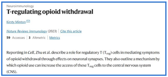 Nature Reviews Immunology评论认为阿片类药物成瘾尚无有效治疗方法,美沙酮维持治疗虽有一定效果,但其副作用大,治标不治本,容易形成新的药物依赖和其他毒品交叉依赖;脑深部电刺激术(deep brain stimulation,DBS)因其治疗效果显著、治疗作用可控可逆等特点,被认为是较有前景的功能神经外科治疗工具,然而DBS在成瘾的治疗中尚处于临床前研究阶段,且该技术是一种侵入性治疗方法,具有一定安全风险。该研究揭示了成瘾人群外周免疫微环境变化,建立起脆弱样调节性T细胞与成瘾行为的免疫学联系,表明了外周免疫功能紊乱导致的中枢结构重塑,是诱发阿片类药物戒断症状的重要因素。该研究强调了成瘾治疗应超越大脑范围,提出了通过远端免疫治疗靶向对抗中枢神经系统功能障碍的可能,打开了免疫干预治疗阿片类药物成瘾的通道。