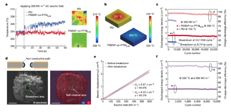 采用红外相机直观地研究了200 oC、300 MV/m下PSBNP-co-PTNI0.02和聚醚酰亚胺(PEI,已知最好的商品耐高温聚合物电介质薄膜)的连续充-放电循环过程中的发热现象,在高导热的PSBNP-co-PTNI0.02薄膜中未观察到局部热积聚现象,而低导热的PEI膜则出现了明显的局部热积聚。研究团队模拟电介质薄膜电容器芯子的热场分布,发现PSBNP-co-PTNI0.02薄膜电容芯子的中心温度远低于PEI薄膜电容芯子,充-放电循环更加稳定,实验也证明PSBNP-co-PTNI0.02薄膜连续充-放电循环寿命是PEI薄膜的6倍。