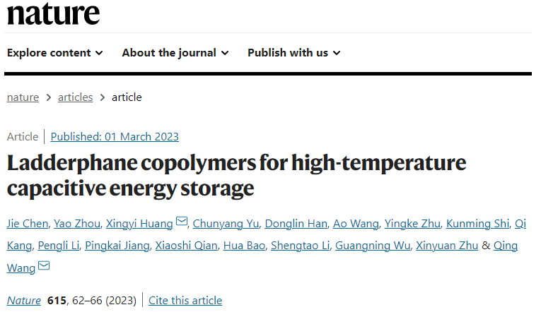 2023年3月2日,国际顶级学术期刊《Nature》刊发上海交通大学化学化工学院黄兴溢教授团队与合作者的研究成果“Ladderphane copolymers for high temperature capacitive energy storage”。黄兴溢教授和王庆教授为通讯作者,陈杰助理研究员、周垚博士和黄兴溢教授为共同第一作者,上海交通大学为论文的第一完成单位。黄兴溢教授和陈杰博士申请的相关发明专利已获得授权。