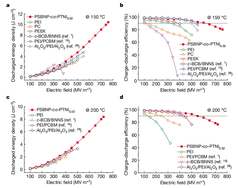 电极化储能测试表明,PSBNP-co-PTNI0.02在150 oC和200 oC下最大放电能量密度分别为10.42 J/cm3和8.37 J/cm3,90%效率下的放电能量密度分别为6.18 J/cm3和5.34 J/cm3,远优于现有的聚合物及其复合电介质薄膜。