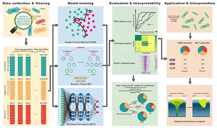 基于以上科学问题,本研究团队在国际上首次运用大数据分析和人工智能手段,开展Jack Hills锆石源岩类型研究。研究团队利用机器学习手段,首先建立了能够识别I型、S型和TTG成因锆石的机器学习方法,然后运用该机器学习方法对Jack Hills锆石进行分类。研究结果显示,尽管一些Jack Hills锆石的确可能来源于TTG岩石,但是大部分(高达70%)被识别为I型和S型成因锆石。考虑到I型和S型岩石通常出现于现今地球的汇聚板块边缘,Jack Hills地区保留的大量I型和S型成因锆石记录很难被垂向运动的“停滞盖层”体制解释;相反,研究结果支持“类似现今板块构造的活动盖层体制在40亿年前就已启动”。