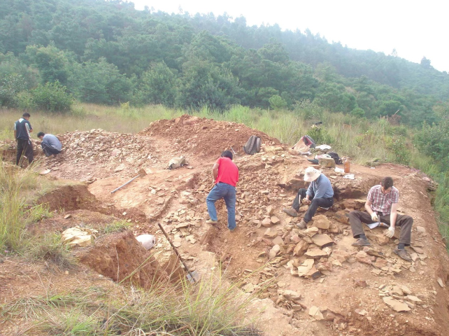 图2.野外工作照。张喜光、杨杰团队成员与来访的英国杜伦大学(Durham University)Martin Smith (右方2米多的高个)在昆明小石坝化石发掘地(杨杰摄影)。