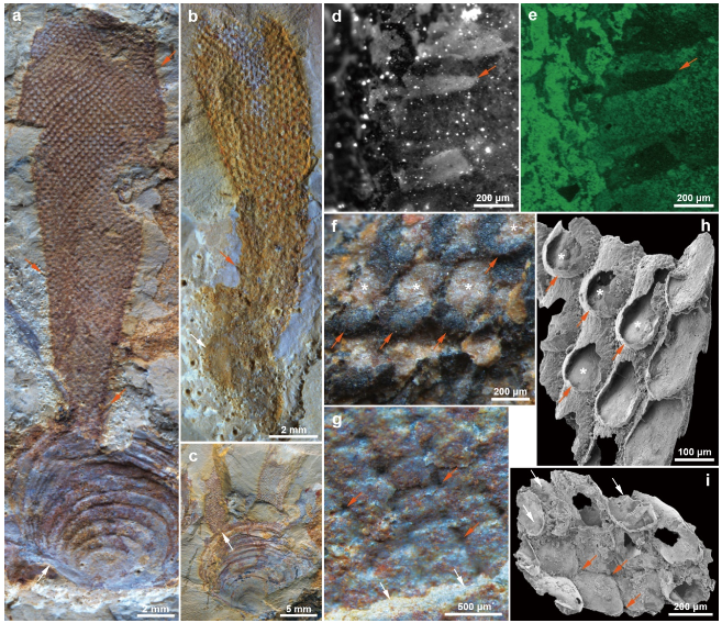 a-c,产自小石坝底栖的Protomelission?,常以附着器(holdfast)固着在动物介壳上(白色箭头),柱状藻体被埋藏压扁,呈条带状具柔软的棘状缘突(橙色箭头).d, e,显示缘突(橙色箭头)细部的荧光和EDX摄像。f-i, 布尔吉斯页岩型的小石坝绿藻与磷酸盐化的 “苔藓虫”的细节比较:f, h, 规则排列的藻体模块,其外表为韧性膜覆盖(橙色箭头),破损后呈无固定形状的残破开口(星号所示),绝非“苔藓虫虫室”的关键构造孔口(Zhang et al. 2021)。g, i, 当柱状藻体(或“苔藓虫”体)一侧的体壁被剥离(白色箭头),藻体(或“苔藓虫”体)另一侧内表面规则排列的菱形模块及彼此间的小孔(橙色箭头)。