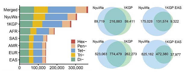 研究团队结合来自“女娲”基因组资源的3983个高深度全基因组测序数据和来自千人基因组计划的2504个高深度全基因组测序数据对STR变异进行了系统性地鉴定。经过严格的质量过滤,共鉴定到366,013个多态性STR位点(pSTR)上的超过155万个等位基因,其中约1/3(523,063个)等位基因为女娲数据集中特异发现的(图2)。
