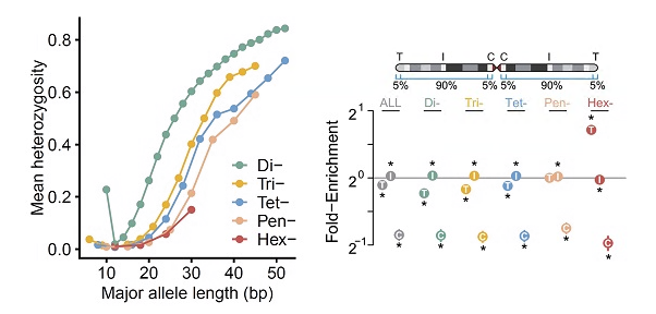 STR的一大特征在于特殊的重复结构,这让它们比基因组其他部分有更高的突变率。其中大多数突变表现为重复单元的扩增或收缩,导致了长度多态性。人们已经发现,大量多态性STR(pSTR)可以调节各种分子和细胞过程,如DNA甲基化、基因表达和选择性剪接,进而影响人类的复杂性状。
