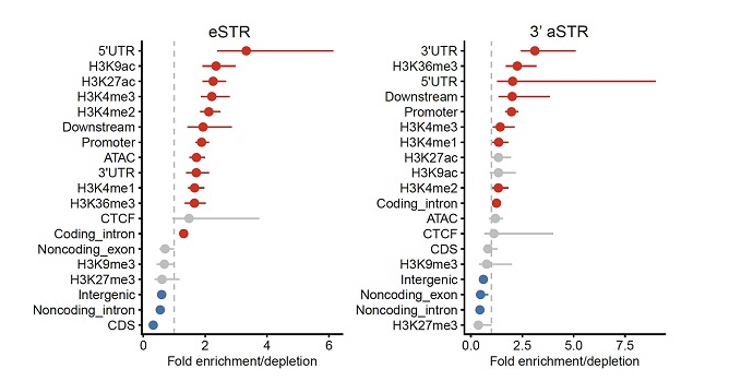 图4. eSTR与3'aSTR在基因组区域中的富集