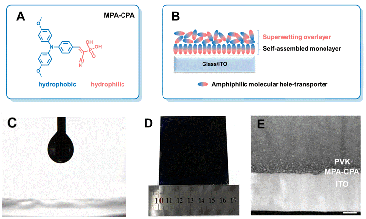 利用该双亲性小分子空穴传输材料,通过动态锚定自组装在透明导电基底氧化铟锡(ITO)上构筑了“双层”膜结构,即“锚定自组装有序单分子层”和“未锚定混乱无序覆盖层”。发生化学锚定的自组装有序单分子层能够牢固的附着在ITO表面确保高效的空穴选择与输运,而未锚定的混乱无序覆盖层由于分子的双亲性和易溶解特征使其表面具有超浸润特性,不仅有利于上层大面积薄膜的均匀制备,而且能有效降低层间界面缺陷浓度。