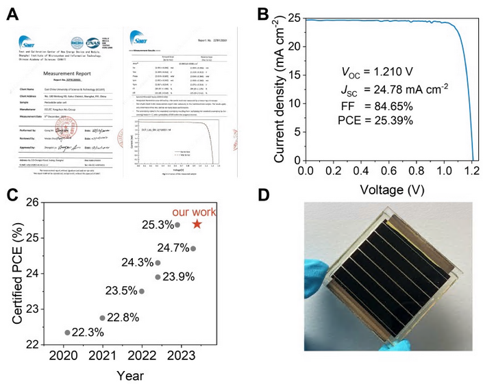 解决载流子输运和界面缺陷难题,突破反式钙钛矿太阳电池认证效率纪录:研究人员所发展的新型小分子空穴传输材料具有可锚定、易溶解、易加工、超浸润等多项优点。基于该新型有机空穴传输材料制备的反式结构钙钛矿太阳电池在第三方机构的认证效率达到25.39%(图2),为目前该类太阳电池的最高认证效率。此外,该新型有机空穴传输材料良好的浸润性十分有利于制备大面积器件,1 cm2的器件和10 cm2的模组分别实现了23.4%和22.0%的效率。需指出的是,该类材料不仅适合于钙钛矿电池,还可用于有机聚合物太阳电池,具有很好的通用性,目前已申请中国发明专利(申请号:202210922068.X)。
