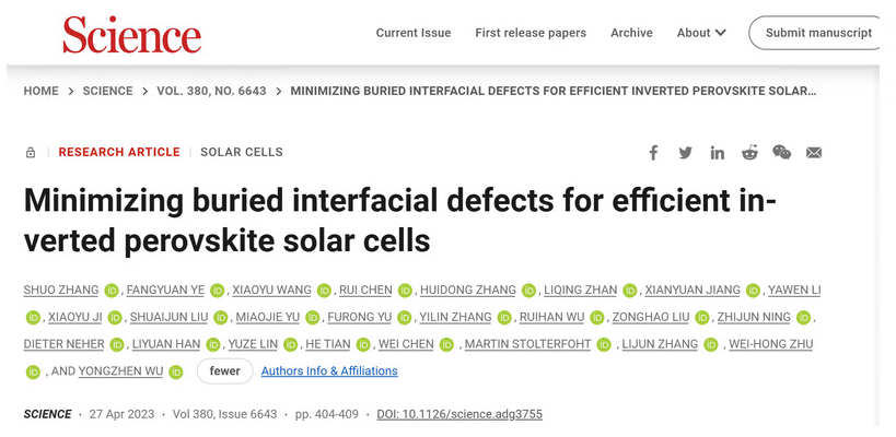 该工作创新引入氰基膦酸单元,发展双亲性小分子空穴传输材料,通过动态自组装构筑有序、超薄、表面超浸润层,一石二鸟完美解决了器件应用中载流子输运和界面缺陷控制两大难题。这是朱为宏教授团队继发表Nature(Nature, 2022, 604, 72–79)后取得的又一重大突破,也是华东理工大学首次以第一通讯单位在Science期刊上发表的研究性论文。
