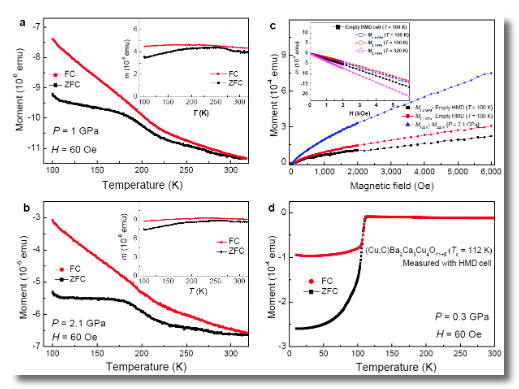 为了进一步探明该类材料中有没有超导电性,还需要从另外一个角度,即迈斯纳抗磁特性方面得到证据。图2 显示的是对镥-氢-氮样品和已知的超导体的磁矩随温度变化关系的测量结果。为了与罗切斯特大学的结果更好地比较,他们使用了同样的磁场(60高斯)。 图2 (a), (b) 主图显示的是包含镥-氢-氮样品和高压测量装置的总磁矩随温度的演变关系,测量条件分别是1万和2.1万大气压,磁场为60高斯。扣除高压测量装置的磁化背景以后,如插图所示,镥-氢-氮样品呈现出的是一个极微弱的正磁矩信号,而且当温度在100-350K之间变化的时候,没有任何对应超导转变的抗磁信号。图2(c)主图显示的是来自于该样品的磁矩随磁场的变化,呈现出一个正值而且单调增加的行为,与超导体的行为完全不符,反而与顺磁金属态的行为吻合。为了与一个真正的超导体的信号进行比较,他们特意选择了一个超导转变温度为112 K的高温超导体 [(Cu,C)Ba2Ca3Cu4O12-d] 进行了同样的测量,其结果放在图2(d)中,可见其磁矩在112 K有一个突然的陡降,低温磁矩信号是负值,其大小是镥-氢-氮的约100倍。因为高压测量装置内腔体积是一样的,因此如果镥-氢-氮是超导体,也应该看见一个相似大小的抗磁信号。很明显,即使压力加到2.1万大气压,镥-氢-氮材料在温度低到100K,也没有呈现出一个超导体应该具有的抗磁信号。上述的电阻和磁化测量数据足以说明该镥-氢-氮材料中不存在近常压的室温超导。