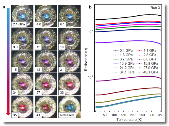下一步是检验其超导电性是否存在。他们开始测量了高压下的电阻随温度的变化,发现在10K以上,6万大气压下是没有超导零电阻现象的。紧接着,他们又测量了更高压力诱导的材料颜色演化和电阻随温度的变化。其结果如图1所