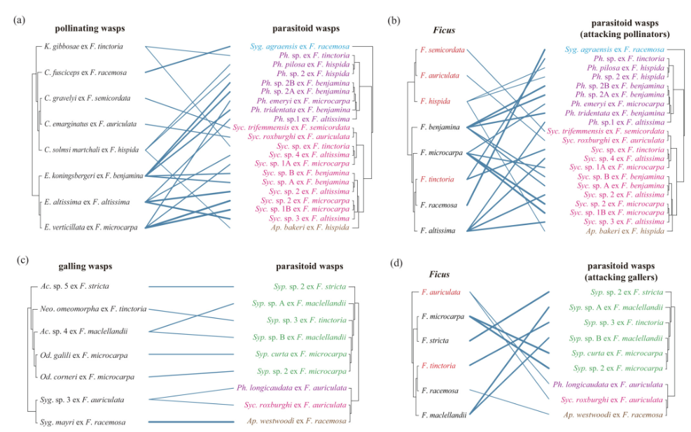 研究发现,寄生传粉榕小蜂的拟寄生榕小蜂物种比造瘿榕小蜂的拟寄生榕小蜂物种多,意味着寄生传粉榕小蜂的拟寄生者之间具有更强的种间竞争。相比于与传粉榕小蜂,拟寄生榕小蜂与造瘿榕小蜂之间具有更一致的系统发育关系和更少的宿主转移事件。这表明拟寄生者的种间竞争而不是宿主昆虫的资源丰富度是该三营养级群落协同多样化模式的主要驱动力。该项研究强调了在植物-昆虫三营养级群落的组装中,高营养级昆虫的种间竞争对于群落的多样化进程具有重要作用。