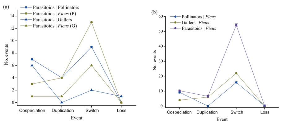 图3 各项协同多样化事件(协同成种、物种加倍、宿主转移和丢失)的分布在(a)不同类群之间,(b)榕树与不同生态型的榕小蜂之间。