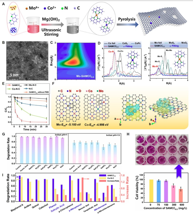 为了克服上述难题,邢明阳教授团队通过构建低细胞毒性Mo-Co双位点单原子催化剂(SAMCC0.5),实现了类芬顿可持续高效降解苯酚、对苯二甲酸、对硝基氯苯等高IP有机污染物。如图A-D所示,以1,10-邻菲咯啉、Co(CH3COO)2和(NH4)2MoO4为前驱体,采用室温下配位自组装再高温热解的方法得到Mo-Co双金属SACs催化剂SAMCC0.5。图E降解苯酚的实验结果表明,在添加PMS的情况下,苯酚的降解速率在3分钟内即可达到78%;而在不添加PMS的情况下,反应液中苯酚的浓度并没有下降。在3分钟内,Co-N-C-PMS体系仅能使苯酚的去除率达到28%。在使用与SAMCC0.5中相同当量的Co元素的Co(Ac)2和CoCl2为催化剂时,苯酚的降解效率并不高。SAMCC0.5-PMS体系的表观动力学常数是CoCl2-PMS体系的19.4倍。即使将CoCl2浓度增加到相同当量的20倍,CoCl2-PMS体系中苯酚的降解速率仍不及SAMCC0.5-PMS体系。密度泛函理论计算结合实验结果证实(图F),SAMCC0.5中的Mo位点更容易吸附有机污染物并介导有机物电子向Co位点转移,促进了PMS的持续活化。图G测试了SAMCC0.5-PMS在极端pH条件下的抗无机盐干扰能力。令人惊讶的是,无论是在pH = 1或是pH = 13的环境中,SAMCC0.5-PMS体系中苯酚的去除率几乎没有受到影响。因此,即使在极端pH条件下,SAMCC0.5-PMS体系仍然具有优异的抗阴离子及无机盐干扰能力。如图H和I所示,Mo介导的有机污染物电子转移机制不仅有效抑制了Co和Mo的溶出降低催化剂毒性,还提高了降解高IP(8.5~9.8 eV甚至更高)有机污染物的效率。该研究对未来设计绿色高效的单原子类芬顿催化剂用于水污染控制具有重要指导意义。
