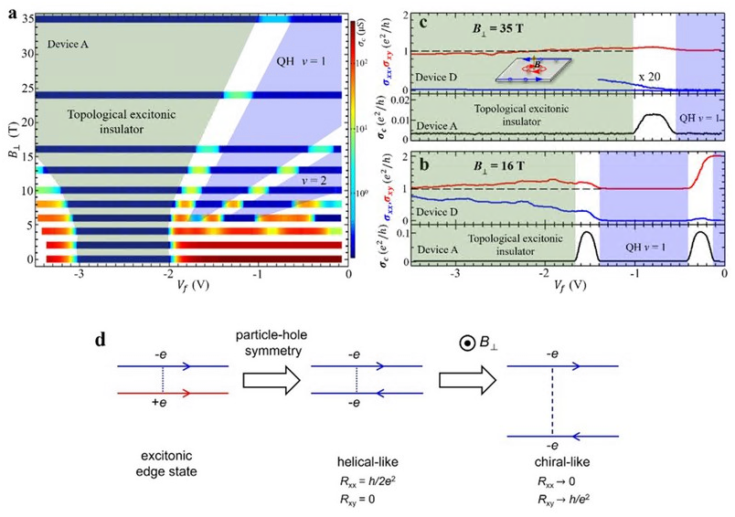 在实验上,团队成员发现在电子和空穴浓度很不平衡的门电压区域内(-2V到-3V), 激子体态始终保持绝缘且存在着能隙,而在此前的研究中,激子绝缘体一般在电子空穴浓度相近时才出现。 在该区域内,输运测量揭示了体系存在着拓扑边缘态,产生了一个拓扑激子绝缘区,如图2a所示。奇异的是,随着垂直磁场的增加,边缘态输运行为从零磁场下的类螺旋型(helical-like)逐渐转变为类手征型(chiral-like);最终在强磁场下,边缘态电导接近量子化值(如图2b,c)。 上述实验现象与传统的霍尔效应截然不同,同时其磁阻行为也区别于量子自旋霍尔效应,无法用目前已知的拓扑物态理解。