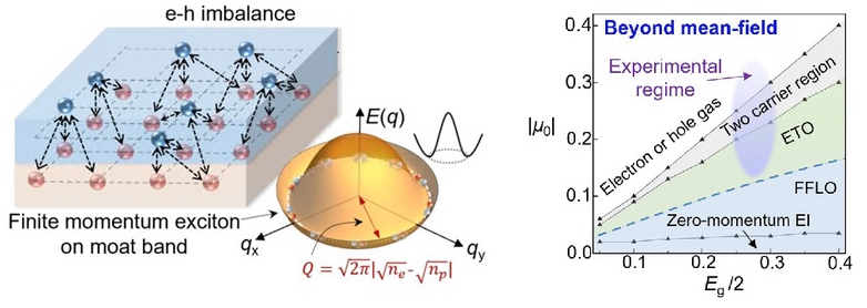 图1(左)在电子-空穴密度不平衡的双层量子阱中形成的moat 能带。(右)双层量子阱激子系统中的完整相图。