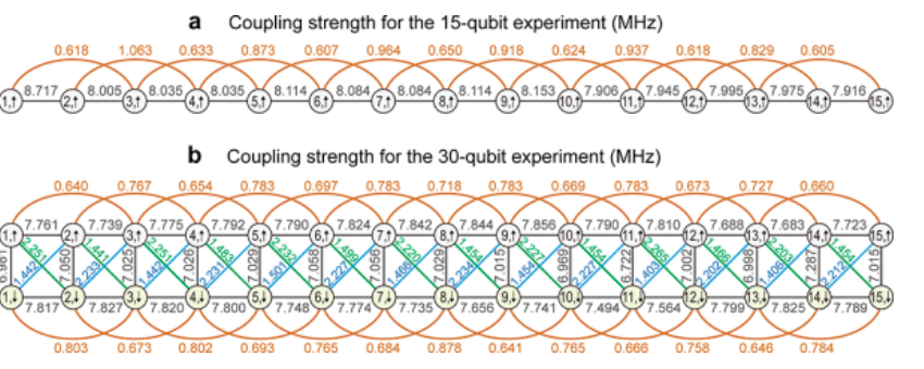 图1. 30比特梯子型量子芯片耦合强度信息。(a)15比特实验中测量到的量子比特间(最近邻和次近邻)的耦合强度信息。(b)30比特实验中测量到的量子比特间(最近邻、次近邻和对角近邻)的耦合强度信息。