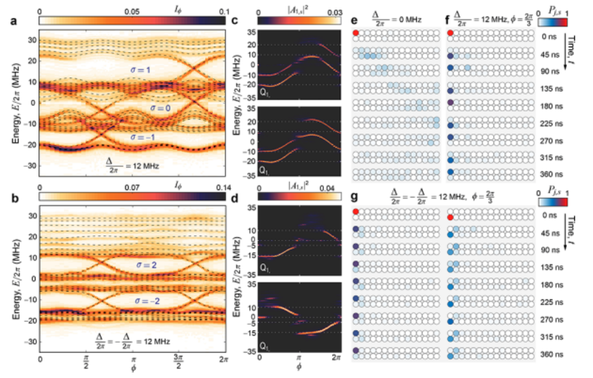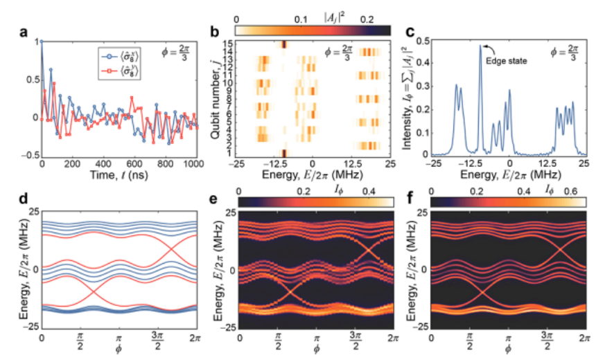 图4. 动力学光谱法测量具有合成维度的二维陈绝缘体的能谱。(a)对应于Q8的随时间演化的数据,其中b=1/3,Δ/2π=12MHz,Φ=2π/3。(b)利用15个量子比特响应函数得到的傅里叶变换振幅的平方。(c)沿着比特维度将傅里叶变换振幅的平方求和。(b)利用15个量子比特参数数值计算求解的二维陈绝缘体的能带结构,其中,b=1/3,Δ/2π=12MHz。(e、f)对于不同的Φ,实验(e)和数值模拟(f)得到的能谱对比。
