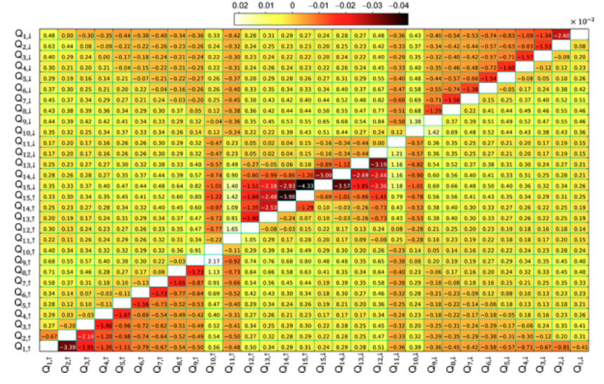 图2. Z串扰矩阵。Z串扰系数矩阵,每个元素代表着当给横轴比特施加1 arb.units幅度的 Z方波时,纵轴比特感受到的方波幅度,后续将根据该系数矩阵进行Z方波矫正。