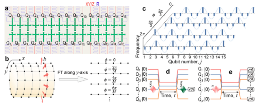 图3. 30比特梯子型量子芯片以及映射AAH模型的实验波形序列。(a)超导量子处理器示意图,其中30个量子比特构成了梯子型结构。(b)通过在y轴进行傅里叶变换,将二维霍夫施塔特(Hofstadter)模型映射为一系列一维不同配置的 Aubry-André-Harper (AAH) 模型的集合。(c)通过改变合成维度准动量Φ用以合成一系列AAH模型的量子比特频率排布,其中b=1/3。(d、e)用以测量动力学能谱(d)和单粒子量子行走(e)的波形序列。
