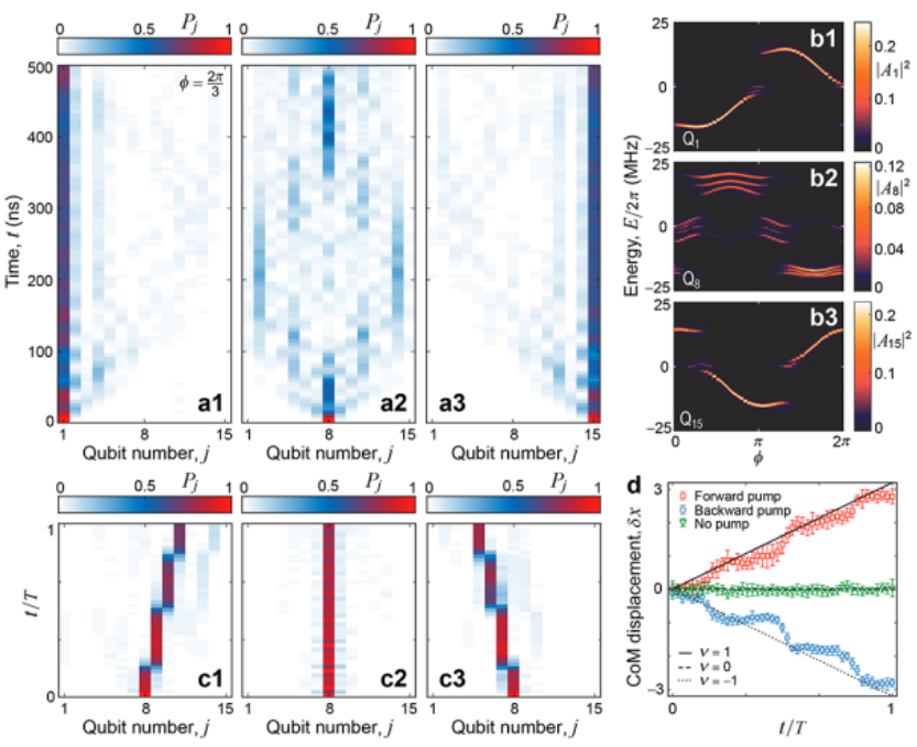 图5. 拓扑边界态的动力学特征以及拓扑电荷泵浦。(a1-3)分别激发Q1(a1)、Q8(a2)、Q15(a3)测量到的激发态概率的时间演化,其中,b=1/3,Δ/2π=12 MHz,Φ=2π/3。(b1-3)分别利用Q1(b1)、Q8(b2)、Q15(b3)作为目标比特测量得到的能谱部分信息。(c1-c3)激发中间比特Q8,测量得到的对应于向前泵浦(c1),不泵浦(c2)和向后泵浦(c3)的激发态概率演化,其中,Δ/2π=36MHz,初始Φ0= 5π/3。(d)根据图(c1-c3)计算得到的质心随着泵浦周期T的变化。