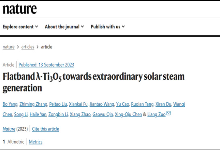 9月13日,Nature在线发表了东北大学左良教授团队、秦高梧教授团队与中国科学院金属研究所陈星秋研究员团队的合作研究结果,论文题目为“Flatband λ-Ti3O5 towards extraordinary solar steam generation”。该论文第一作者为东北大学材料科学与工程学院/材料各向异性与织构教育部重点实验室杨波副教授,通讯作者为左良教授。