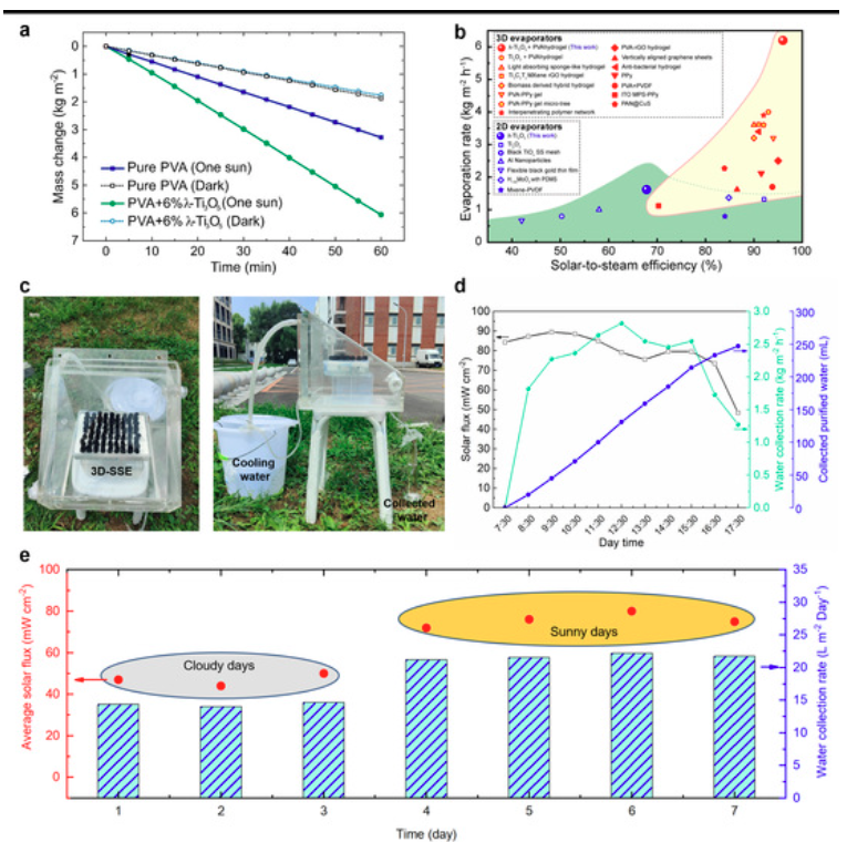 图3. a,λ-Ti3O5-PVA三维多孔连通结构蒸发器的蒸发速率; b,不同光热转换材料蒸发器的蒸发速率与光-气转换效率比较; c,户外海水淡化装置; d,太阳光能量、淡水收集速率和收集淡水总量随时间变化; e,日平均光通量和淡水收集速率