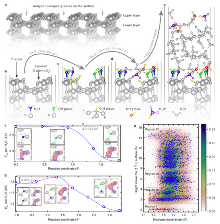 图2. a,λ-Ti3O5(1-10)表面的U型槽结构; b-e,水分子在λ-Ti3O5(1-10)表面的吸附和分解第一性原理分子动力学模拟; f-g,水分子在λ-Ti3O5(1-10)表面分解的能垒计算(f-表面吸附1个水分子,g-表面吸附2个水分子); h, λ-Ti3O5(1-10)表面不同水层中的氢键长度分布