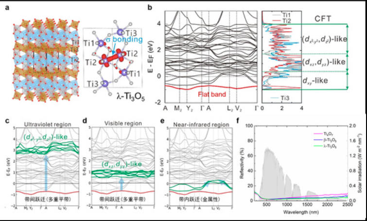 图1. a,λ-Ti3O5晶体结构及Ti-Ti二聚体; b,λ-Ti3O5能带结构与电子态密度; c-e,λ-Ti3O5在不同波长光照下电子跃迁示意图(c-紫外,d-可见,e-近红外); f,Ti4O7、β-Ti3O5和λ-Ti3O5实测反射光谱