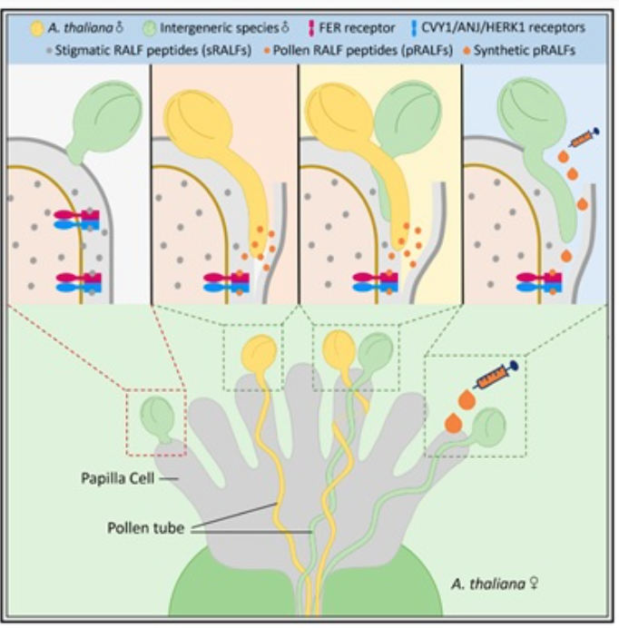 10月7日,北京大学生命科学学院、北大-清华生命科学联合中心、新基石科学实验室瞿礼嘉教授/钟声副研究员团队在Cell期刊在线发表题为“Antagonistic RALF peptides control an intergeneric hybridization barrier on Brassicaceae stigmas”的研究论文,在分子水平上解析了拟南芥柱头识别并接受自己花粉以及近缘花粉而不接受远缘花粉的机制,提出了柱头-花粉间识别与信号交流的“锁-钥模型”,阐明了柱头处的种间/属间生殖障碍形成机理,解释了“花粉蒙导效应”。这一模型的核心元素包括如下组分:1)由柱头的乳突细胞表面的受体FER/ANJ/HERK1/CVY1、乳突细胞自分泌小肽sRALF1/22/23/33,以及细胞壁蛋白LRX3/4/5这些组分协作构建成“锁”,该“锁”能阻止花粉管穿入柱头;2)自己的花粉以及近缘植物种的花粉携带的7个旁分泌小肽pRALF10/11/12/13/25/26/30即为“钥匙”,该“钥匙”打开柱头处的“锁”,使得花粉管可以穿入柱头。远缘植物的花粉由于没有携带这把“钥匙”,打不开柱头处的“锁”,因而远缘植物的花粉管就无法穿入柱头,这就形成了不同植物种间/属间杂交的障碍。如果把同种花粉与远缘花粉混合授粉,由于同种花粉携带有“钥匙”,可以打开“锁”,远缘花粉管跟着同种花粉管一起穿入柱头,这就是“花粉蒙导效应”。特别需要强调的是,通过突变去除柱头处组成这把“锁”的任一组分,“锁”的功能就会失效,远缘花粉管就可以穿入柱头,在柱头处的植物生殖障碍就会被打破。更为重要的是,人工合成同种花粉携带的“钥匙”(即同种花粉的pRALF小肽)施加到柱头上,可以完美地替代“同种蒙导花粉”,让远缘花粉有效地穿入柱头,克服柱头处的这一关键生殖障碍(见下图)。应用这一成果,他们在两种于两千七百万年前开始分化的、现在分属两个不同属的植物种之间实现了远缘杂交并获得杂交胚。