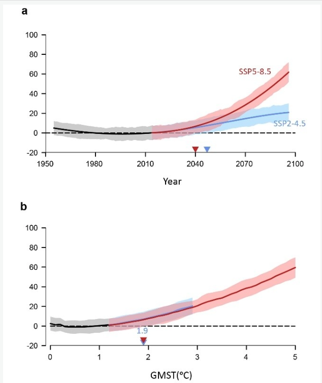 研究团队进一步计算了人为活动引起的高原增湿在何种情形下会超过气候系统内部变率的影响。研究发现,在SSP2-4.5和SSP5-8.5排放情景下,当全球平均温度较之工业化前的升温达到约1.9℃时,人类活动的影响将超越气候系统内部变率的影响,从而主导高原东南部夏季降水变化。