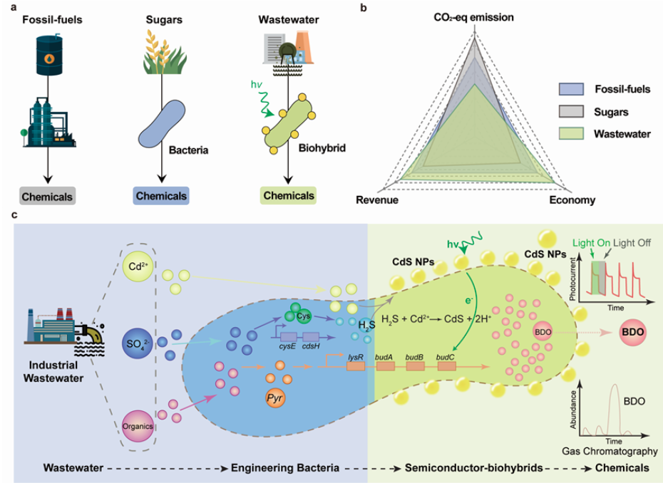 “变废为宝”的理念与可持续性发展高度契合。近年来,通过合成生物学方法改造微生物细胞工厂,可直接利用废弃塑料、餐厨垃圾和工业废气(如CO2)等作为原料,已经展示出绿色可持续生产化学品的巨大潜力。来自深圳先进院的合成生物学团队和哈工大(深圳)环境科学与工程团队共同调研发现,金属离子、硫酸盐和有机物等污染物在废水中普遍存在且含量丰富,可直接或间接为半导体材料-细菌杂合体的生产提供原料,降低规模化生产杂合体的成本;而且,该杂合体在废水中能够直接利用光能驱动有机污染物转化为化学品,实现污染物的资源化利用。