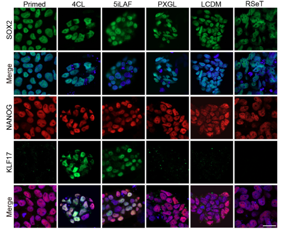 图1.不同培养条件下猴胚胎干细胞中SOX2,NANOG和KLF17的免疫荧光。