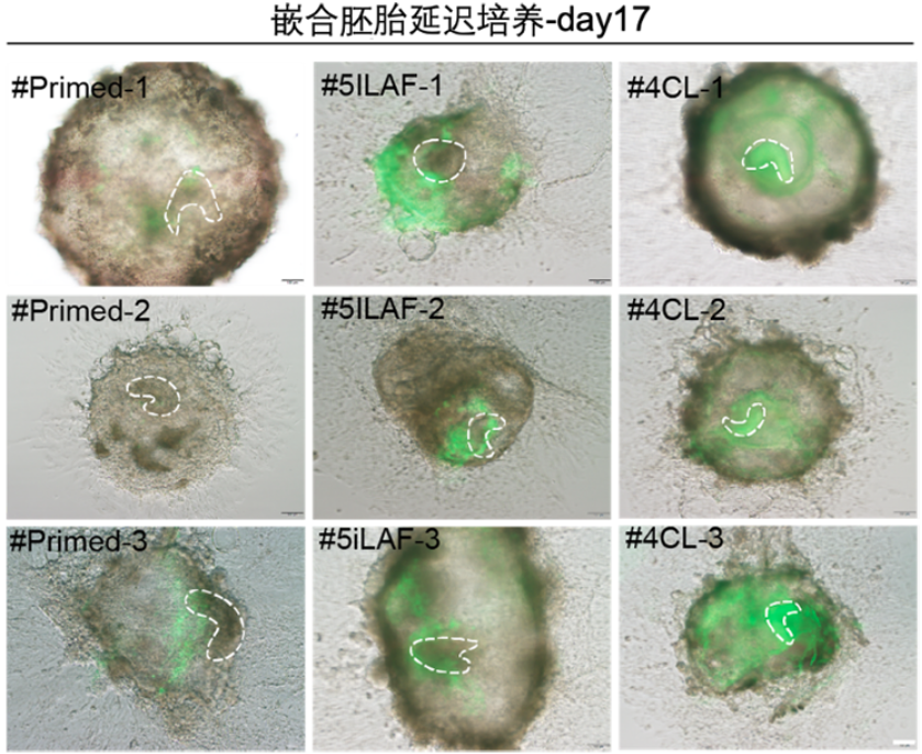 胚胎干细胞注射入受体胚胎后的快速凋亡是影响胚胎干细胞成功嵌合的关键。研究团队选用绿色荧光蛋白标记的4CL条件下的胚胎干细胞进行猴胚胎注射实验,通过测试干细胞注射入胚胎后的不同培养基和培养时间的组合,最终得到了既不影响胚胎正常发育又能保证干细胞存活的最优嵌合胚胎培养条件。而且5iLAF和Primed体系下的胚胎干细胞在该优化条件下也表现出胚胎注射后的高存活率。将注射了4CL和5iLAF干细胞的嵌合胚胎分别在体外延迟培养到第17天,发现注射的胚胎干细胞仍然可以高效存活,单细胞测序表明猴胚胎干细胞可以与受体胚胎细胞同步发育,并且贡献到第17天猴胚胎的不同细胞谱系中。