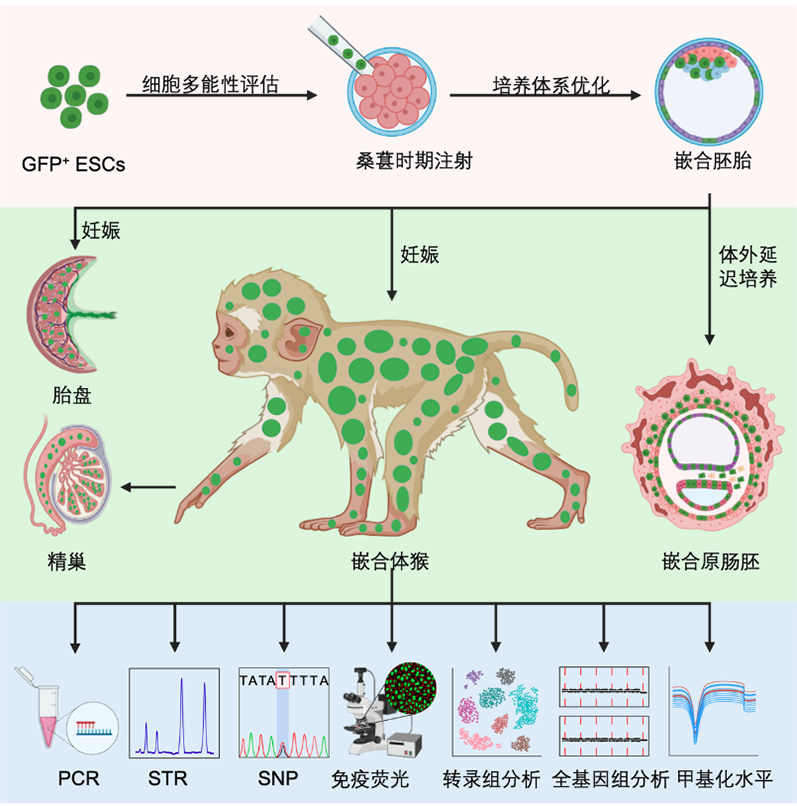 在系统性评估了不同培养条件下猴胚胎干细胞状态和改进优化了嵌合胚胎培养条件的基础上,研究团队进一步将注射了绿色荧光标记的4CL干细胞的胚胎移植到代孕母猴。在总共得到的10只出生或流产的仔猴中,有一只出生存活猴和一只流产猴检测到胚胎干细胞的嵌合。研究团队建立了包含PCR扩增、微卫星亲子鉴定、基因组单核苷酸多态性深度测序、流式细胞仪检测、绿色荧光蛋白检测、免疫荧光检测的一系列严格的嵌合体分析流程,发现出生存活猴中胚胎干细胞的贡献比例高达70%左右,流产猴中胚胎干细胞的贡献比例约20%。单细胞转录组测序也进一步表明了注射的胚胎干细胞可以跟受体胚胎细胞同步分化到出生个体猴的各种不同细胞谱系中。