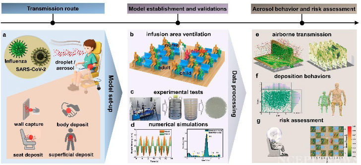 在后疫情时代,呼吸道病原体呈现多途径传播的特征。目前对儿童在室内环境中的易感性、短期空气动力学以及暴露风险的认知存在缺乏,尤其在人员密集的医疗环境中,儿童面临的生物安全问题亟待关注。当前最受关注的问题之一是在人员密度大、密集接触可能性高的密闭环境中,儿童相比成人对呼吸道病毒的易感性存在何种差异,以及病原体的不同传播途径对儿童感染的相对贡献是如何衡量的。为解决这一问题,刘志坚教授团队以某医院儿童输液区为研究对象,进行了实验和计算分析,以评估与呼吸道病原体相关的暴露风险。研究结果为密闭环境内呼吸道病原体的传播规律、以及如何应对全球/季节性流行的呼吸道疾病暴露风险提供了理论支持。