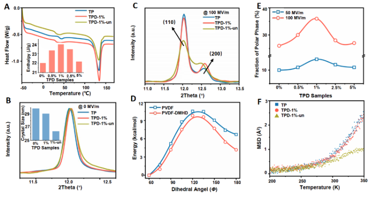 DSC和XRD测试结果说明了改性样品的结晶度略微提高,晶粒尺寸略有减小,这暗示了极性结晶畴确实大部分被限制在界面上,在体积分量上的表现并不显著。原位WAXD研究了电场作用下三维体相晶体结构的动态转变,引入的DMHD小分子确实会诱导基底聚合物产生强烈的相变。DFT和MD模型也直观表明,DMHD可以降低非极性-极性相变势垒,由于界面氢键相互作用的存在。弹性中子散射结果显示未退火前TPD-un的均方位移最小,表明氢离子被紧密限制在小分子表面附近,通过牺牲DMHD可释放大表面积的极性构像界面的约束,促使TPD产生巨电卡效应。