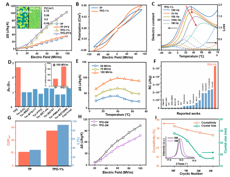 采用Landau-Ginzburg-Devonshire热力学模型,并辅以相场模拟来模拟实验测试的ECE,以提供定量的理解。通过对介电性能分析,极化强度和介电常数的提升证实了界面增强型电卡效应材料的存在。同时介电击穿电场也提高了近150%,有利于电卡制冷实际循环运行。作为牺牲剂的DMHD创造的极性构像提高了材料整体的介电性能,没有像永久性复合填料那样带来各种不利并发症。改性后的纳米孔极性界面暴露在不受物理约束的自由体积中,这显著提高了TPD样品的单位极化对熵的贡献能力。